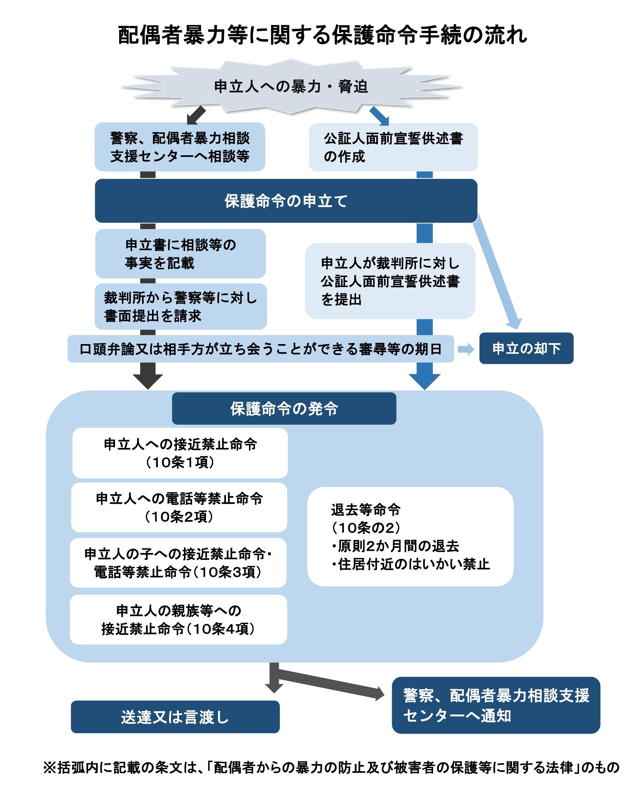 保護命令制度とは、配偶者や生活の本拠を共にする交際相手からの身体に対する暴力等を防ぐため、被害者の申立てにより、裁判所が、加害者に対し、被害者へのつきまといをしてはならないこと等を命ずる命令です。